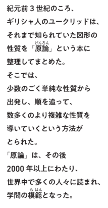 このメッセージの「それまで知られていた図形の性質を整理してまとめた」という原論の精神に着目したいところです。