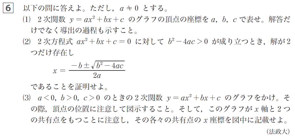 (1)では解答だけでなく導出の過程も示すことが要求されており,結果を知識として知っているだけでなく,表現力・記述力が求められています。(2)の解の公式の証明も同様です。