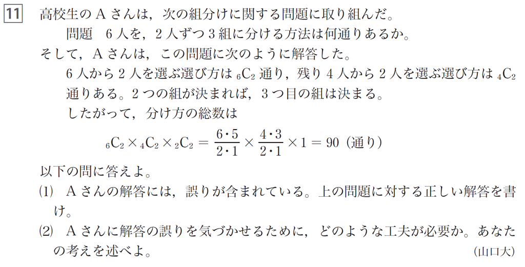 組分けの問題です。(1)は教科書や参考書の例題にあるような問題です。しかし(2)は,Aさんの解答の誤りに気づかせる工夫の考えを述べさせる内容で,解答の誤りを分析し,誤答を正す工夫が求められており,思考力・表現力が求められます。