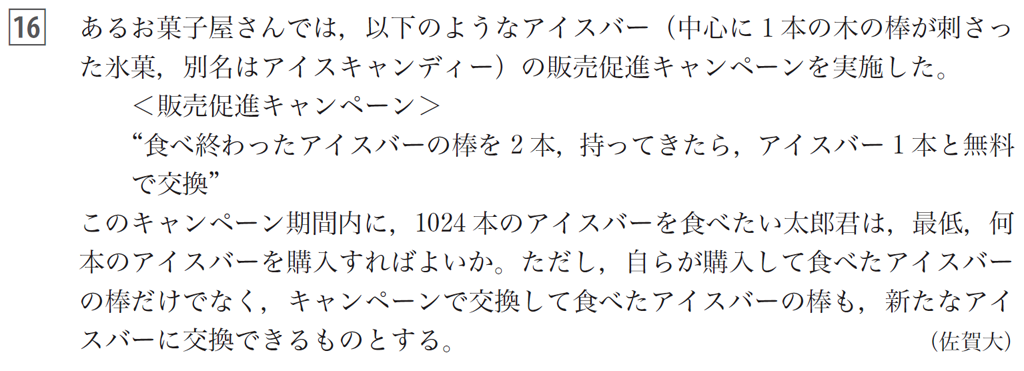 アイスバーの“あたり”という日常の題材から出題されています。解法は,1次方程式はもちろん2進法の利用なども考えられ,いろいろな知識をどう活用するかが問われています。