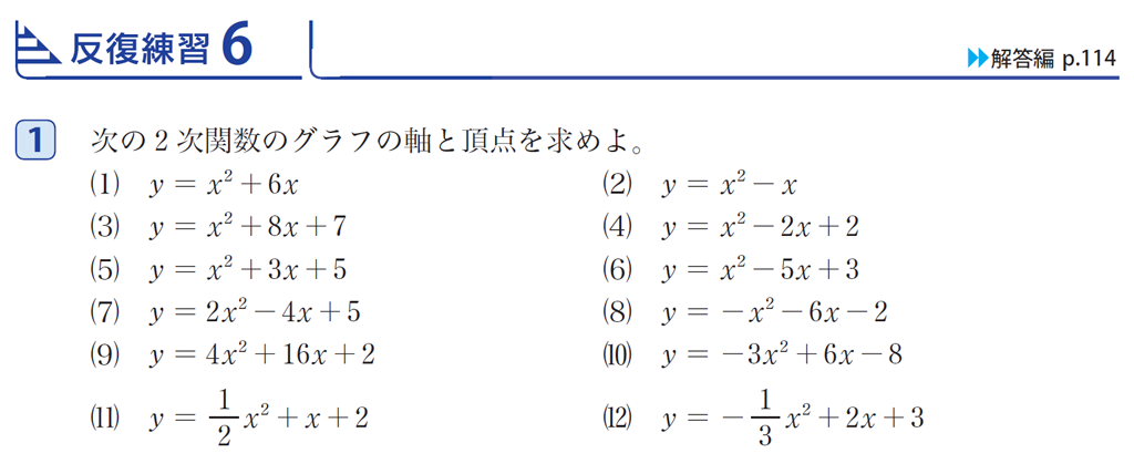 平方完成は決して簡単ではなく,式変形で{ }を付け忘れて計算ミスをするなど,様々な誤りのパターンがあります。例題・練習を解いても定着に不安のある場合は,この「反復練習」をご活用ください。