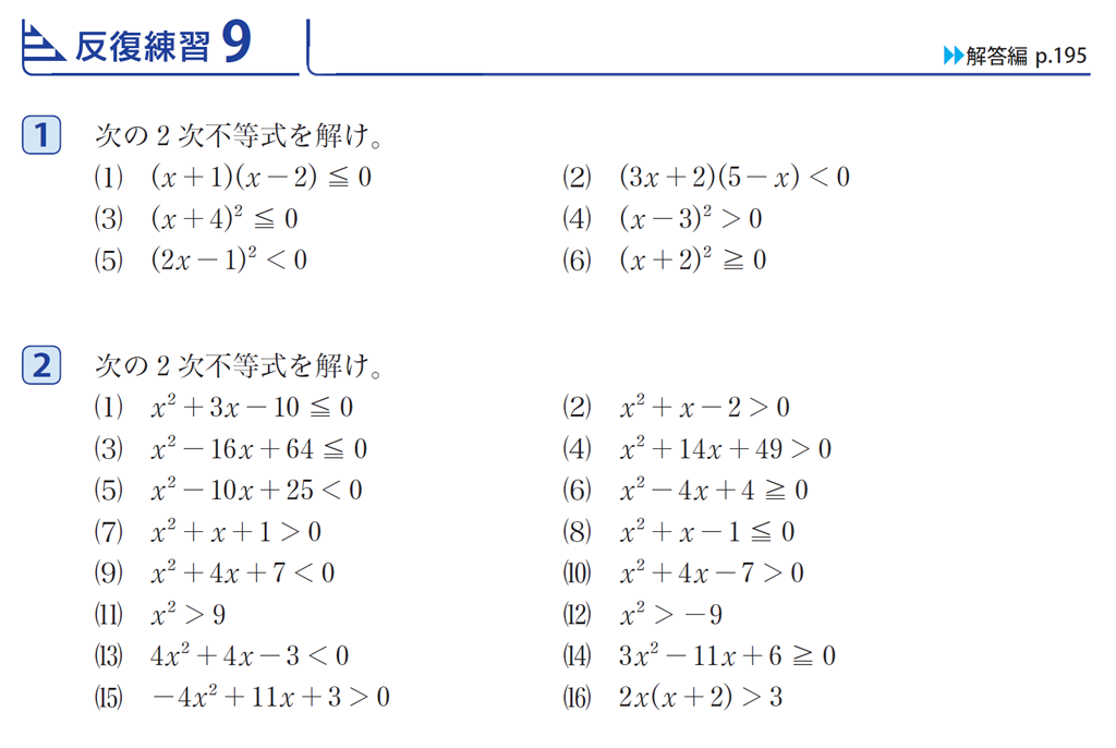 さらに 2では,因数分解を利用/解の公式を利用,移項が必要なもの,4種類の不等号,グラフが下に凸/上に凸,グラフと \(x\) 軸の共有点の個数が2個/1個/0個と,様々な型を網羅しています。また,(7)と(8),(9)と(10),(11)と(12)は似た問題を左右に並べており,不等号や符号の違いで結果が大きく変わることが実感できます。