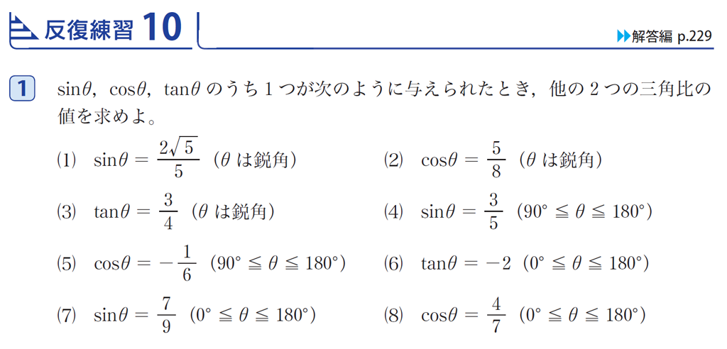 三角比の相互関係は,残り2つの三角比のうちどちらを先に求めるか,3つの公式のうちどれを使うかを考えなければいけません。\(\theta\) の範囲によって,三角比の値の正負や,1つに定まらない場合などにも注意が必要です。