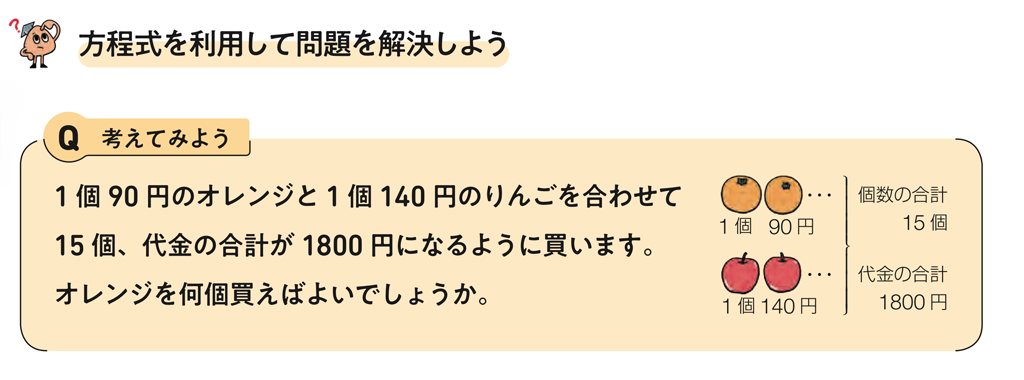 生徒は、「\(x\)はどんな数でもよいのだから、\(x+x=x\)」のように\(x\)をプレースホルダーとしての□と同様な扱いと捉え、誤った考えをもつことがあります。例えば、3章p.105「1次方程式の利用」のオレンジとりんごの問題で、誤って両方とも個数を\(x\)とおいてしまうかもしれません。ここでは、このような□とは異なり、同じ文字は同じ数を表していることをしっかりと確認したいところです。