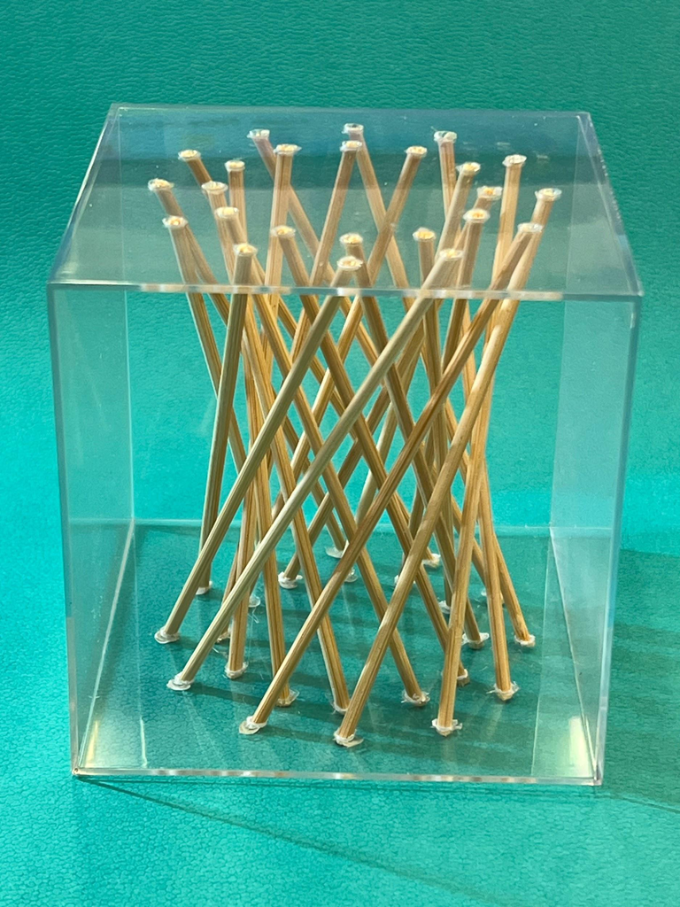 これで仕組みがわかったから、二重構造の模型だって作れるよ。アクリルの箱の上下に、こんなふうに穴をあけるんだ。まずは内側の12個の穴から、竹串を差し込んでいく……