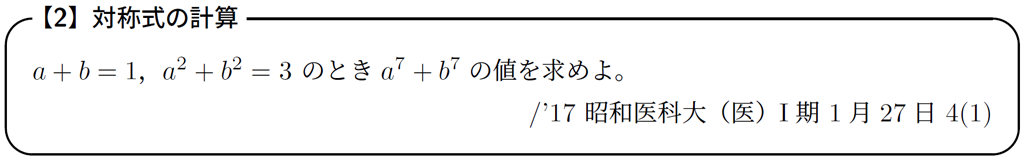 典型的な対称式計算に見えますが,求めるものが \(a^7+b^7\) という7次式になっているという点がポイントです。\(a^2+b^2\) や \(a^3+b^3\) なら,\((a+b)^2\),\((a+b)^3\) の展開式からツジツマを合わせれば良かったわけですが,\((a+b)^7\) の展開式から考えるのはメンドウです(できないわけではありません)。そこで,ひと工夫することを考えてみてほしいのです。(解答例はこちら)