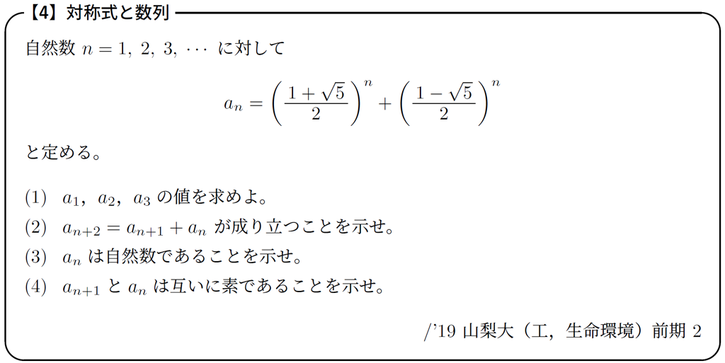 ところで,④式は「\(\alpha^3+\beta^3\) を \(\alpha^2+\beta^2\) と \(\alpha^1+\beta^1\) で表している」形になっているので,数列 \(\{ \alpha^n+\beta^n \} \) の漸化式がぼんやりと見えています。このことを踏まえて,次の問題を見てみましょう。