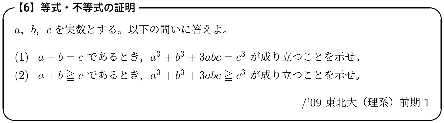 (2)では,直方体の3辺の長さを \(\alpha,\beta,\gamma\) とおき,体積を \(V\) とすれば,(1)を利用できることに気付けるはずです。ここで注意しなければいけないのが,「 \(\alpha,\beta,\gamma\) はすべて正の実数でなければいけない」ということです。(解答例はこちら)