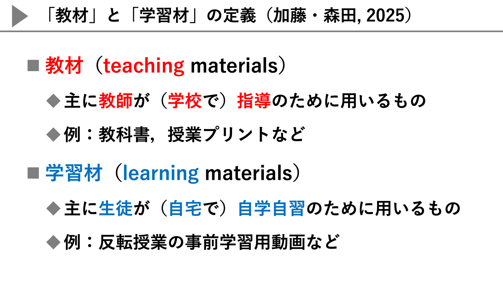 通信制高校において主(メイン)となる自学自習支援を考えるために,はじめに「教材」と「学習材」を,以下のように定義します。