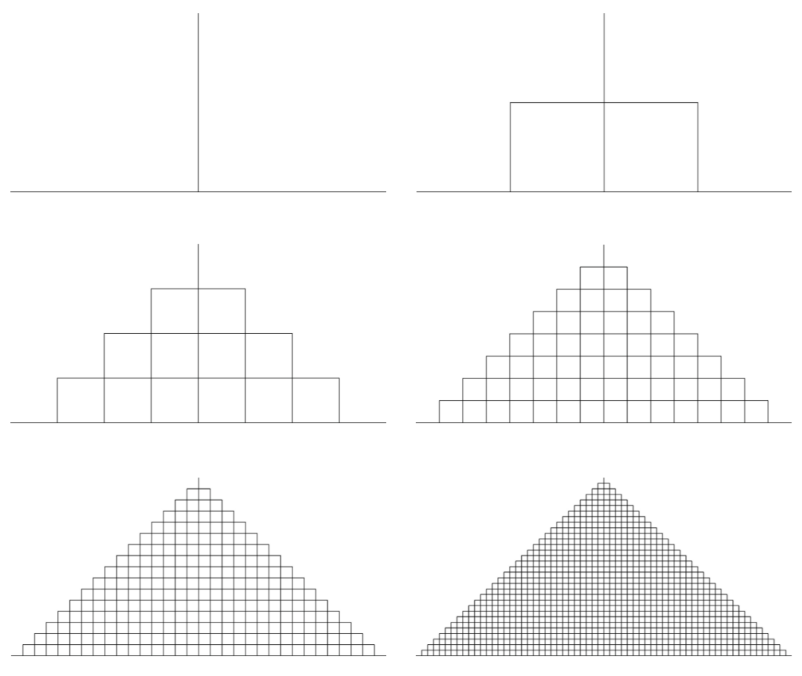 \(\alpha\) が \(90^\circ\) のときのコッホ曲線 \(K(\cfrac{\pi}{2})\) は,底辺 \(1\), 高さ \(\cfrac{1}{2}\) の三角形を充填する曲線を得ます。これはイタリアの数学者ペアノ(Giuseppe Peano,1858-1932)が示した正方形を充填するペアノ曲線(1890)と同じものになります。曲線はパラメータが一つで書けるので1次元曲線とみなせますが,正方形は明らかに2次元です。1次元曲線を重ならないように充填すると2次元になることから,そもそも次元とは何かという議論が始まりました。