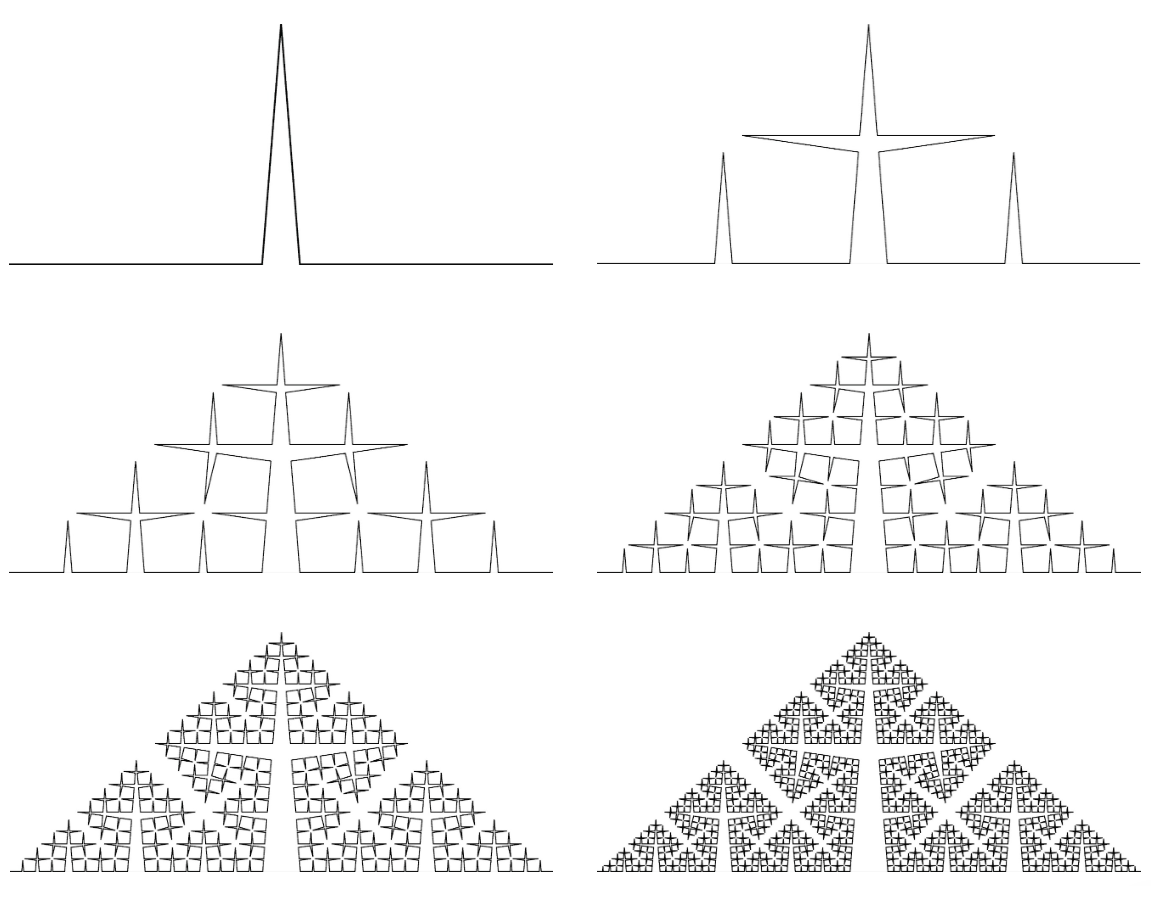 ヒントとして,さらに \(p\) を大きくした \(p = 20\) の場合を書いてみましょう。下図は,1次~6次のコッホ曲線 \(K(\cfrac{\pi}{20})\) です。